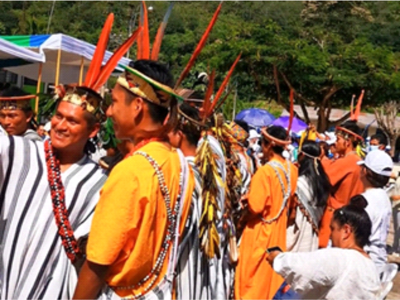 Al llegar, ¡qué espectáculo tan maravilloso! Varios miles de personas estaban presentes, muchas de ellas con sus trajes indígenas, en este pequeño pueblo de La Florida. ¡Qué emoción! Rodeados de música y bailes, comenzamos las ceremonias.
